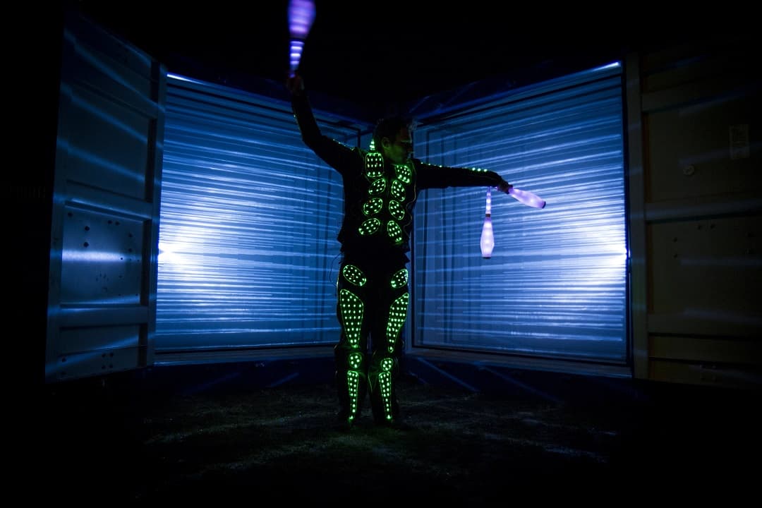 Deze LED ACT zorgt voor instant sfeer op avond- en nacht-evenementen. Met zijn lichtgevende jongleerprops baant hij zich moeiteloos een weg door het publiek en creëert hij verrassende interacties.