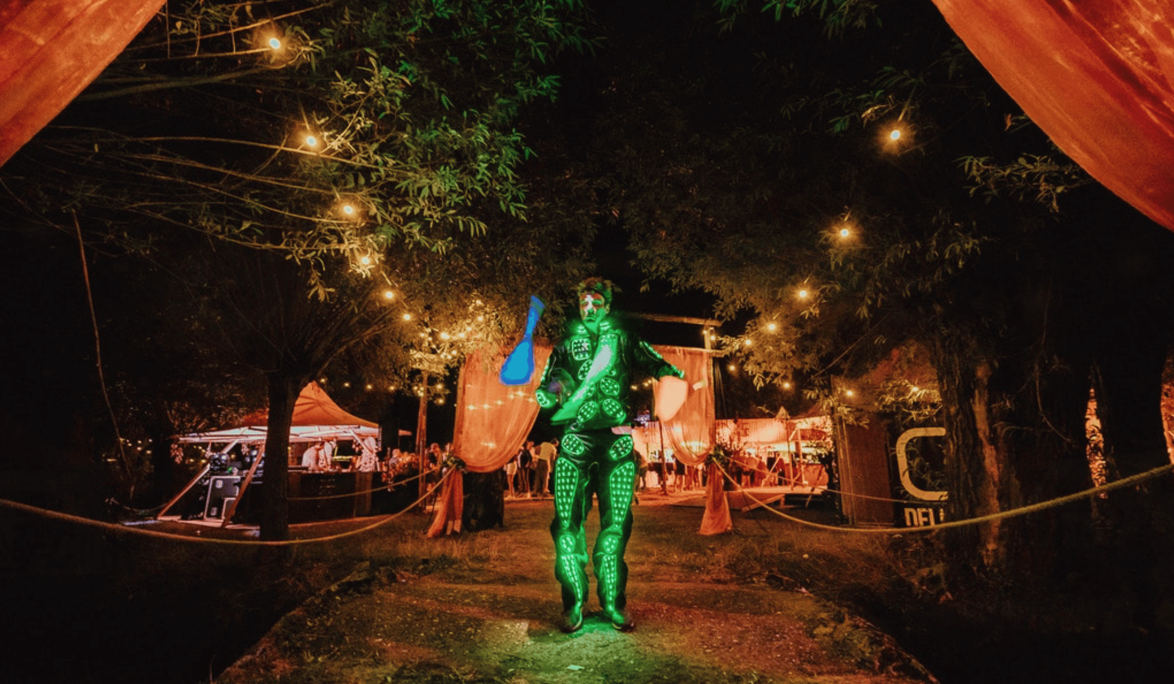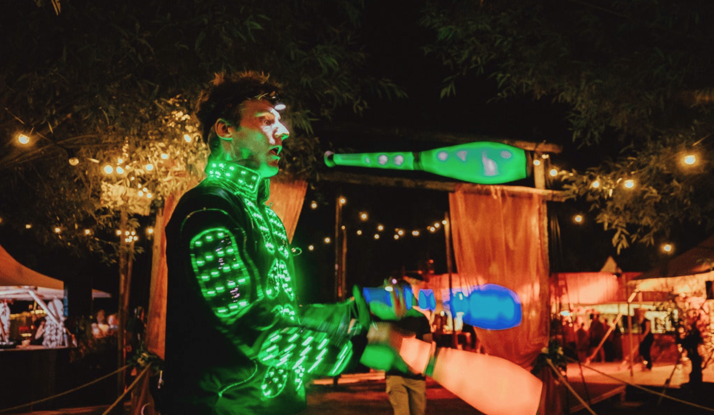 De lichtjongleur beweegt zich met lichtgevende jongleerprops door het publiek en zorgt voor speelse interacties. Aan de allerkleinsten delen de artiesten fluorescerende glowsticks uit.